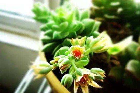 翡翠景天的花序是在枝条的顶部生长,花型为伞状,一般每株花开的数量是在6~12朵之前,颜色为玫瑰红色,千佛手花型奇特,花苞时期会被周围的叶片所围绕,等叶子张开的时候才会出现花苞,并且花开颜色为黄色。