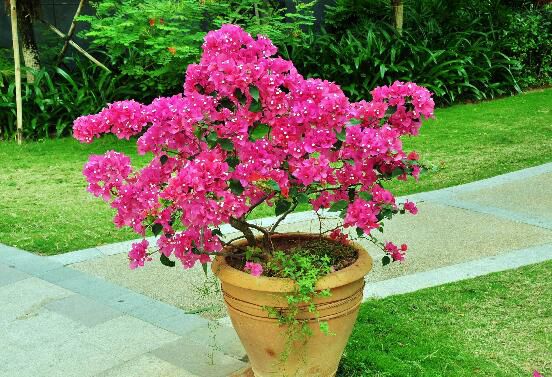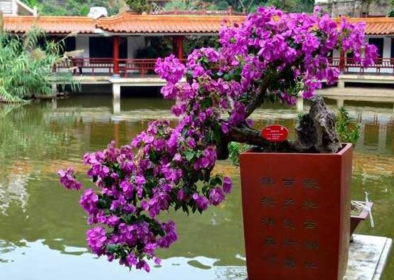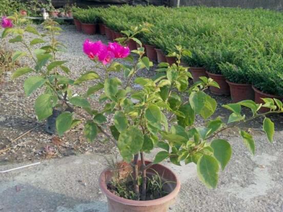 三角梅盆景通常适合采用长方形或者椭圆形的紫砂陶盆或者釉陶盆,盆的颜色不可过深,颜色太深无法衬托出三角梅苞片色彩的艳丽。三角梅的盆土适合用疏松而且排水性良好的营养土。